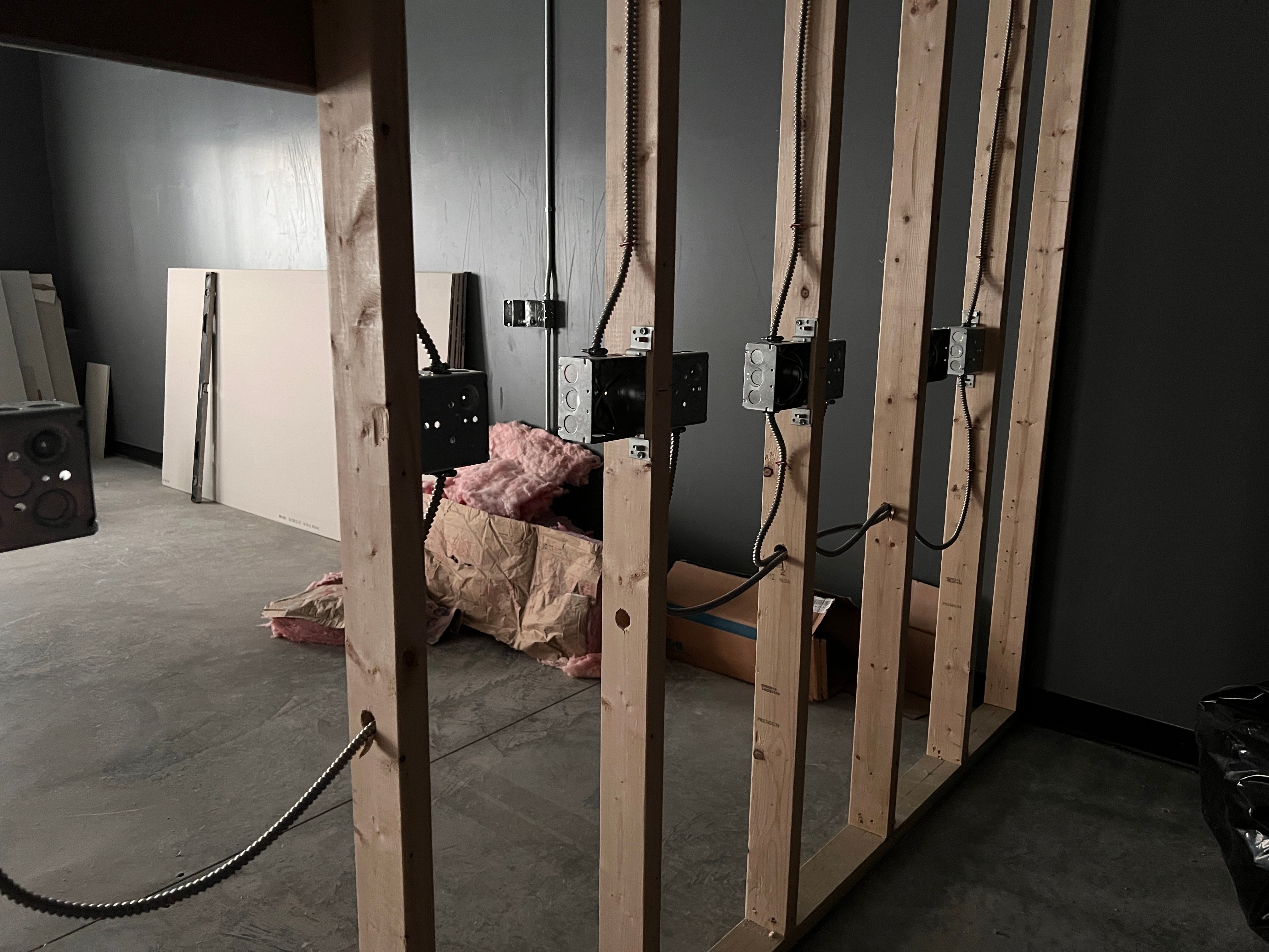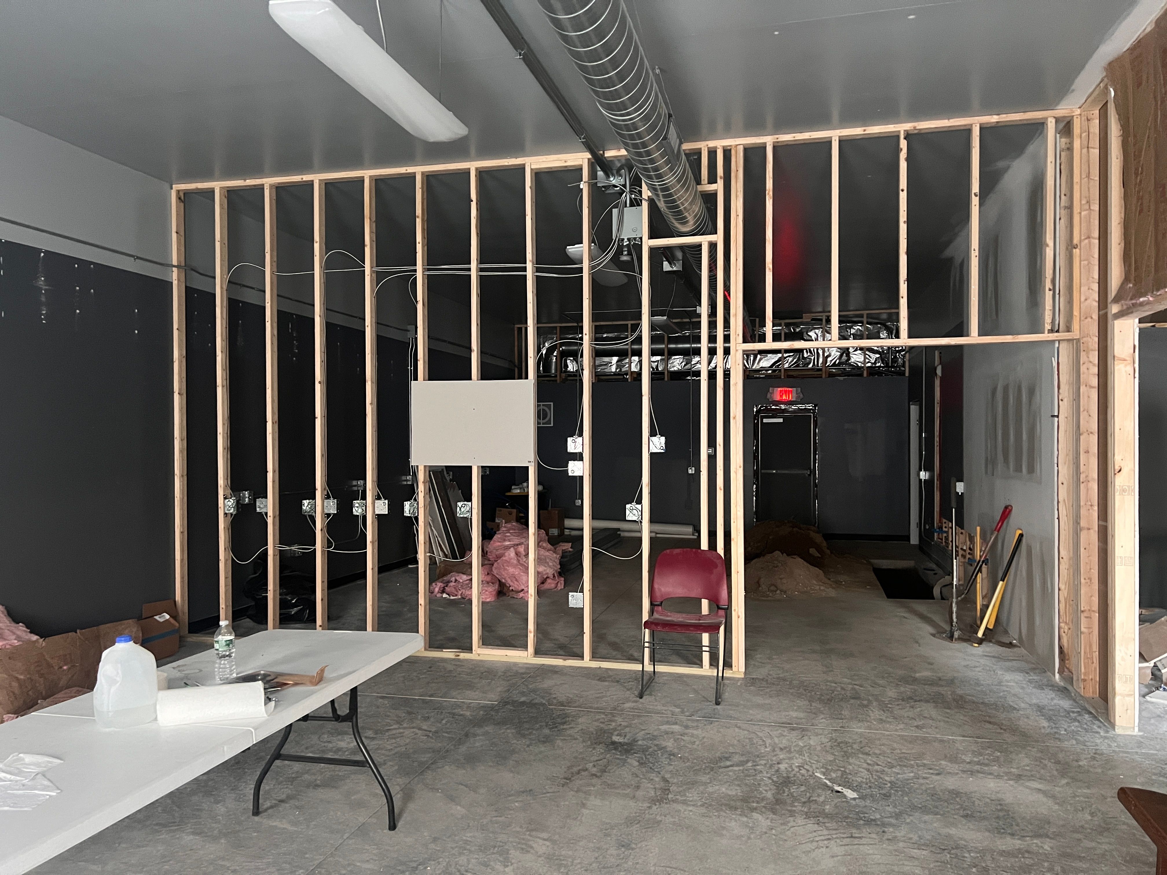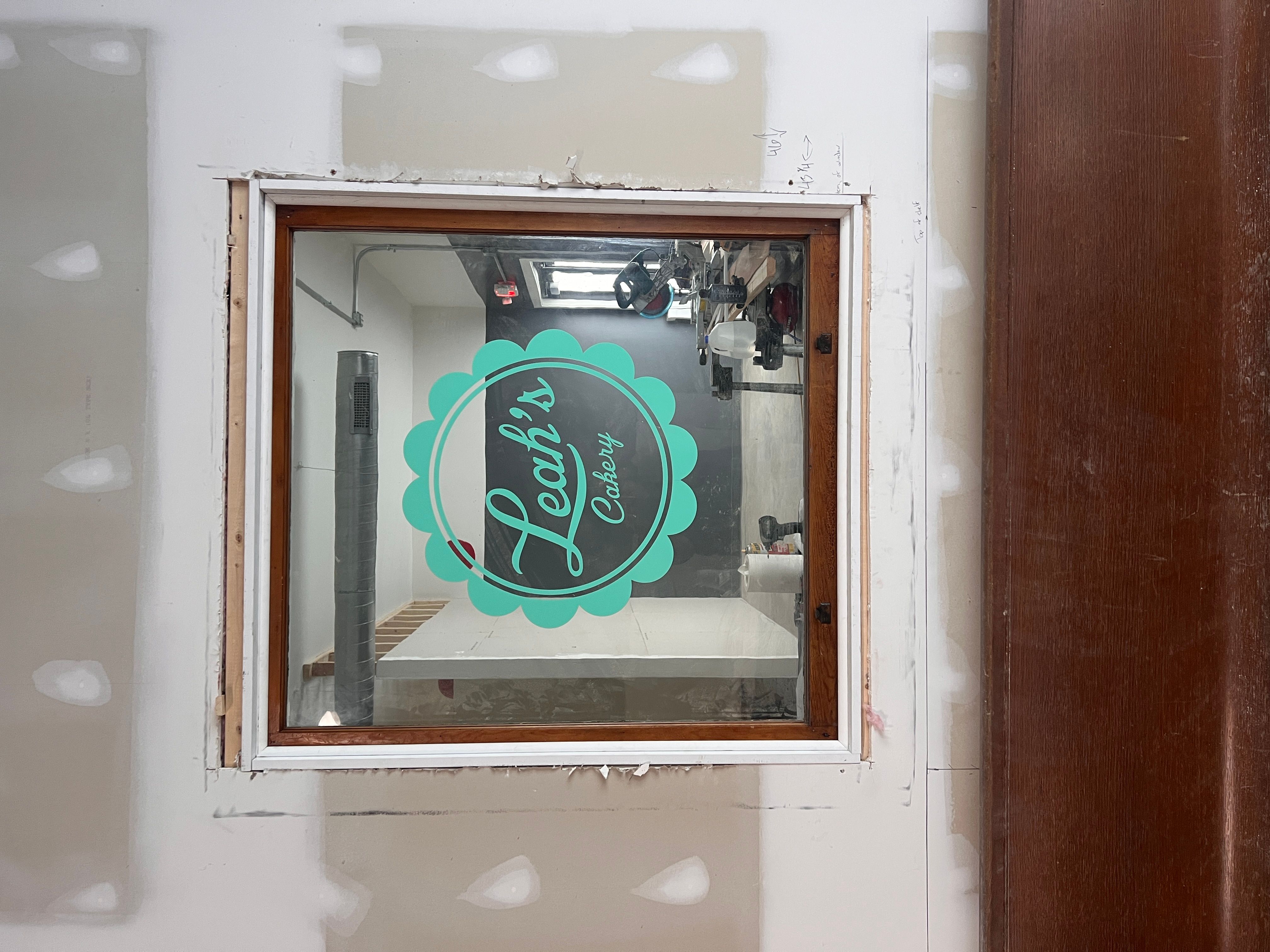 We are making progress! Walls are built, doors and windows are cut out and electrical is being roughed in. It is starting to resemble the drawings! We even got the kitchen wall panels up- yessss! Our door decals and Coming Soon window panels are up- they even have a QR code to easily scan and get up-to-date updates. Thanks for following us along this journey of building Leah's Cakery Uptown location.