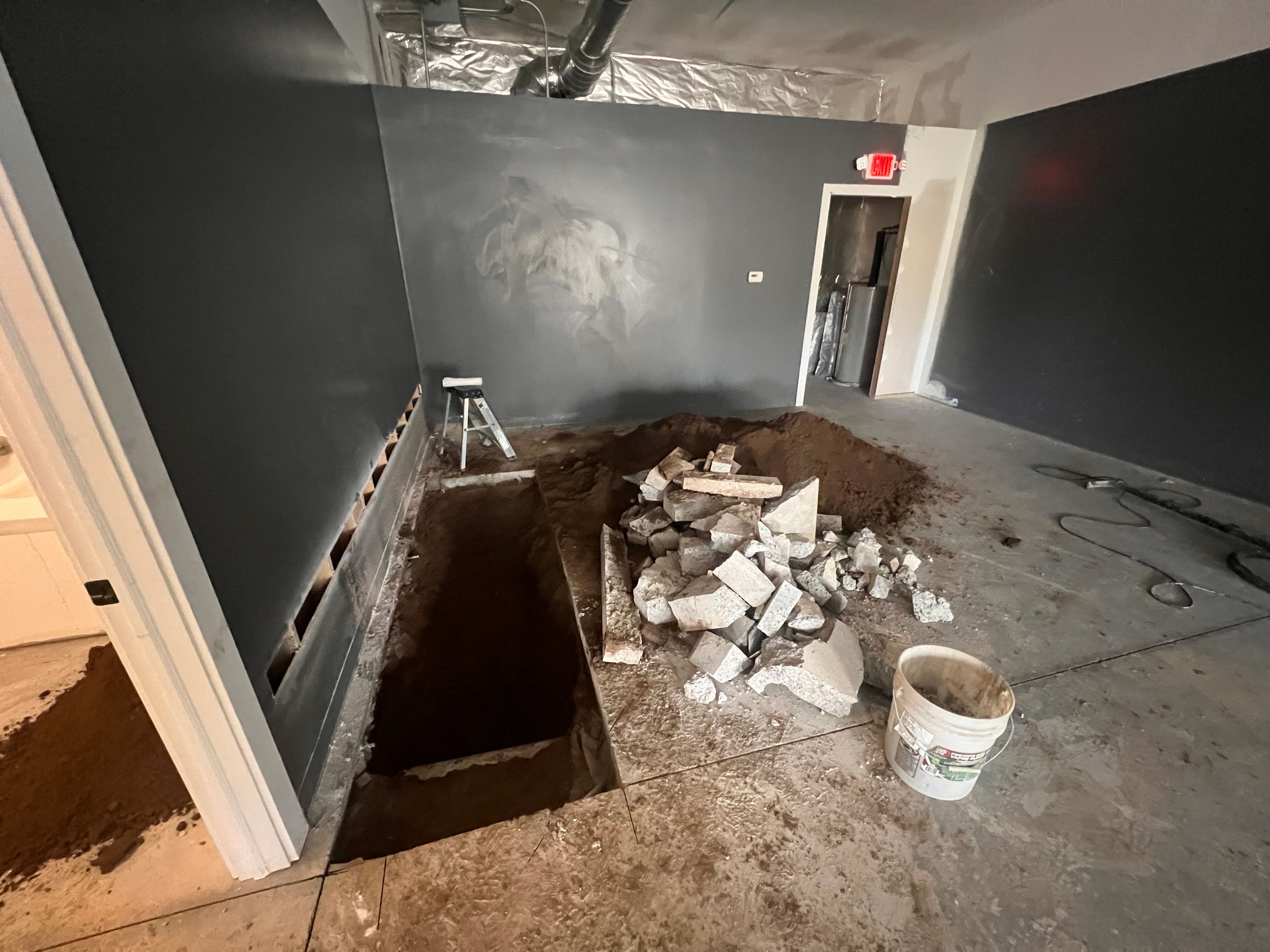 Woohoo, construction has started at the new location! We received our building permit and jumped right in! First thing- find the sewer line and get the plumbing roughed in. Since this space was previously occupied by a gym, they didn't need 3 bay sinks, dishwashers, mop sinks and handwashing sinks. That's a few extra drains to connect. And we also have cut a hole in the wall connecting the two spaces. It's getting exciting to see the space start its transformation into the kitchen, classroom and retail space I have designed with the assistance of my architect. Oh yeah- I almost forgot- our automatic dishwasher has arrived! Our first piece of equipment to arrive for the new kitchen. And this is a delight to myself and staff who have hand scrubbed dishes, bowls, and pans for years. Soon we will be able to slide them in for a wash with no more than a slight movement of an arm.